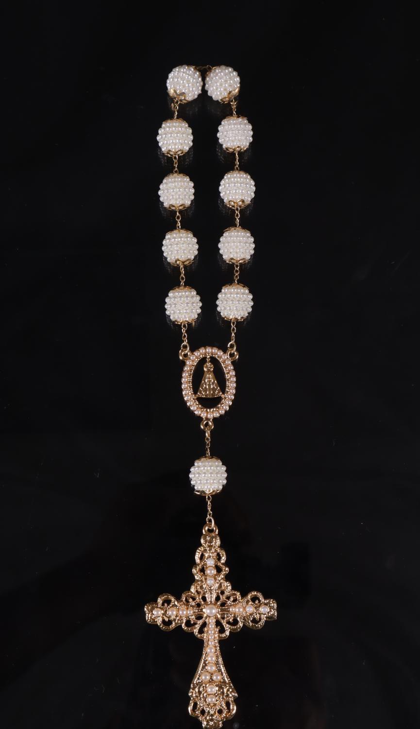 BOLA FRAMBOESA 12MM CREME CORRENTE DOURADA TREVO APARECIDA STRASS VAZADA CRUZ NOIVA STRASS
