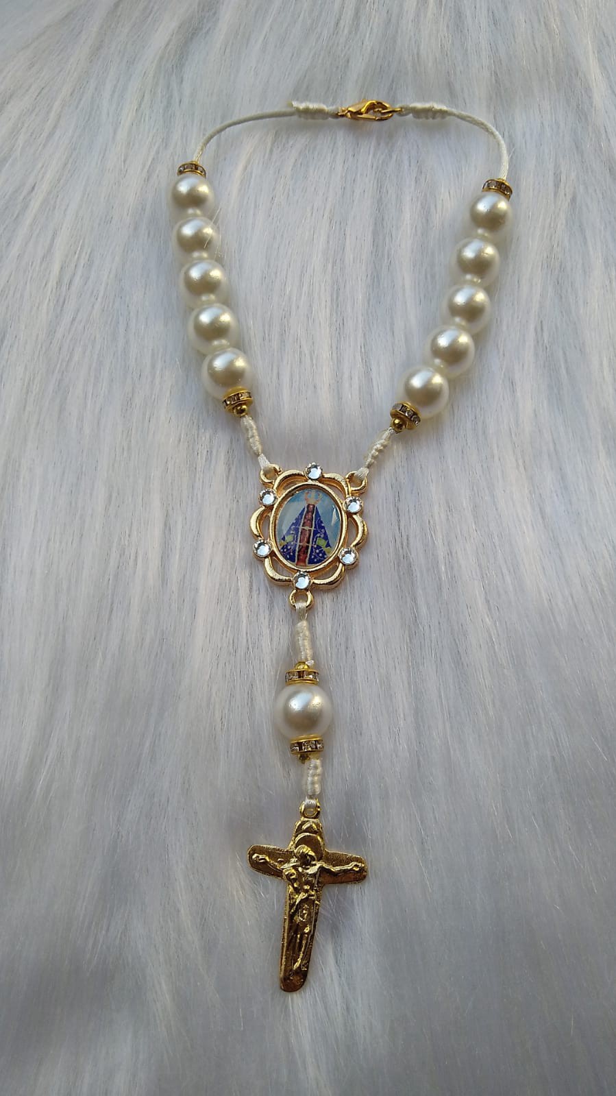 DEZENA CONTAS PEROLA 10MMCREME DETALHES COM ELOS STRASS TREVO PQ FOTO APARECIDA STRASS CRUZ UNIDADE- DOURADO