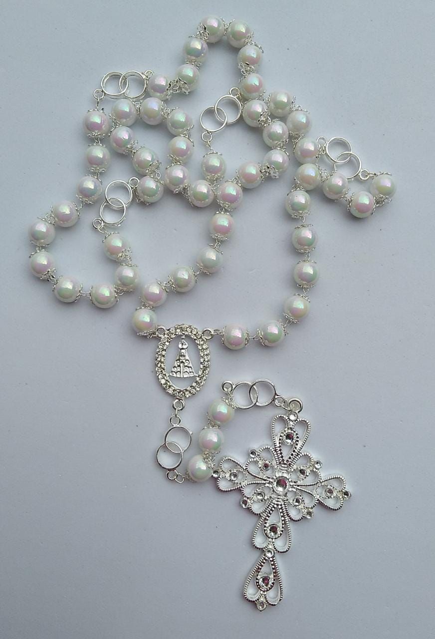 TERÇO DE NOIVA CONTAS PEROLIZADO 10MM BRANCA COM TULIPAS EM TODAS AS CONTAS TREVO APARECIDA E CRUZ PRATA AMBOS COM ACABAMENTO EM DETALHES EM STRASS- PAI NOSSO DE ALIANÇA