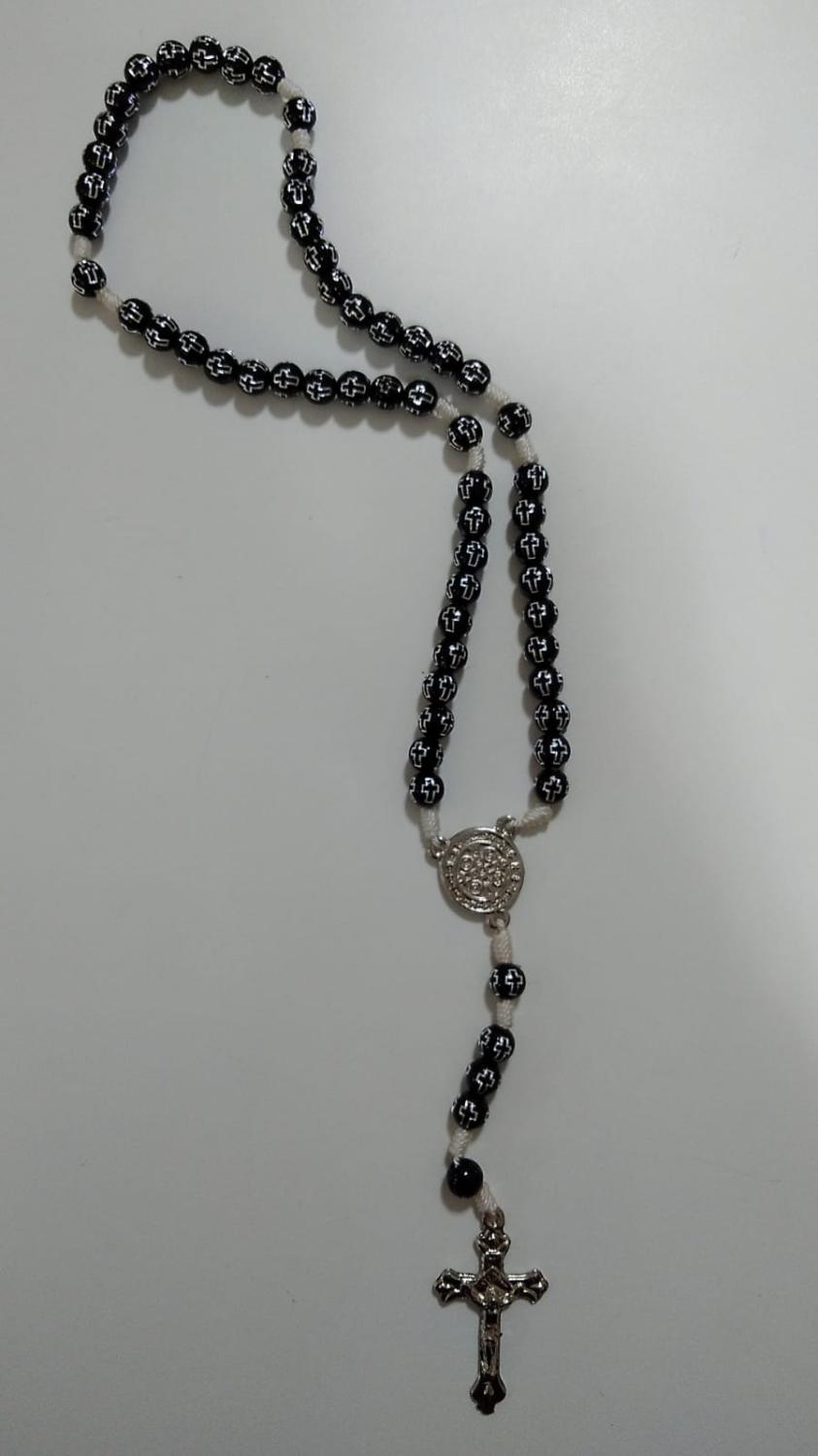 BOLA CRUZ 8MM PRETA FIO BRANCO TREVO SÃO BENTO NIQUEL
