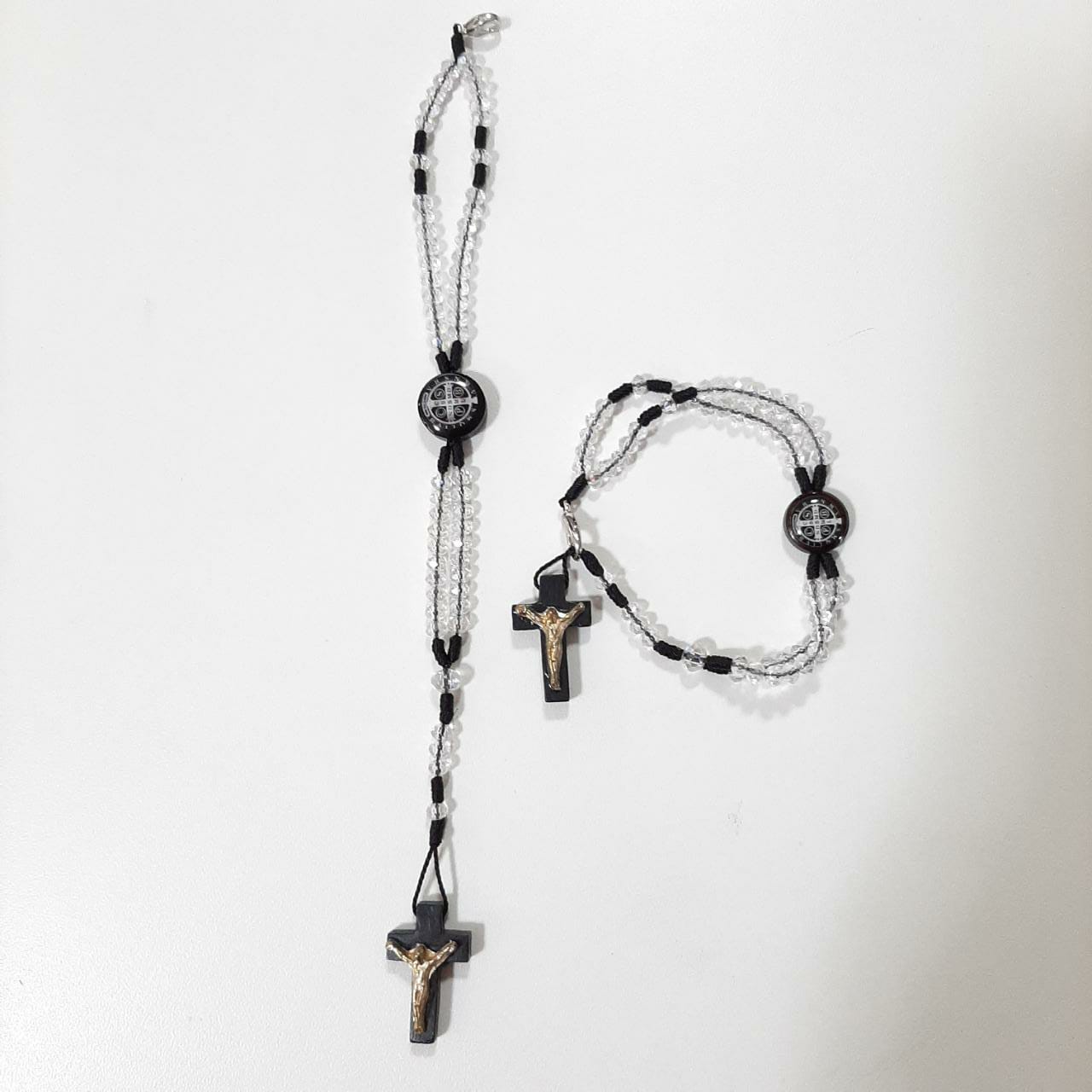 CONTAS EM CRISTAL 4MM TRANSPARENTE FIO PRETO ENTREMEIO MADEIRA RESINADO CRUZ MADEIRA FECHO