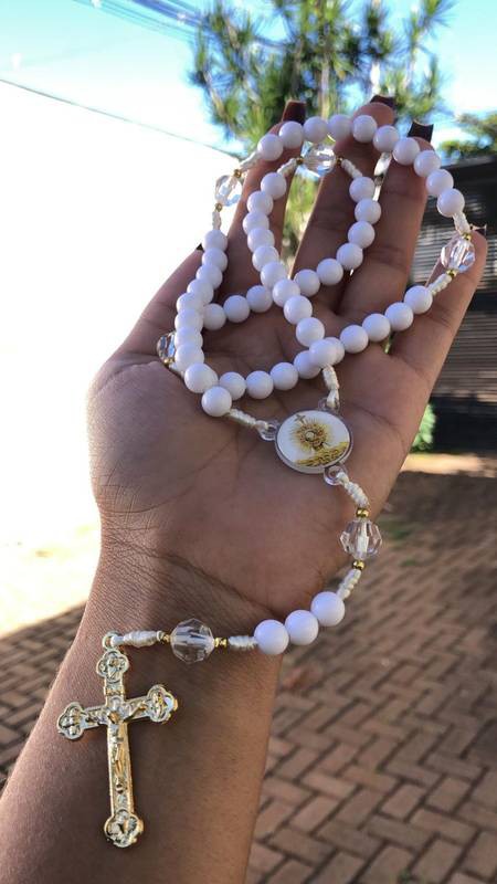 TERÇO EUCARISTIA CONTAS PLASTICA BRANCA 8MM TREVO ACRILICOCRUZ FLOR DOURADO