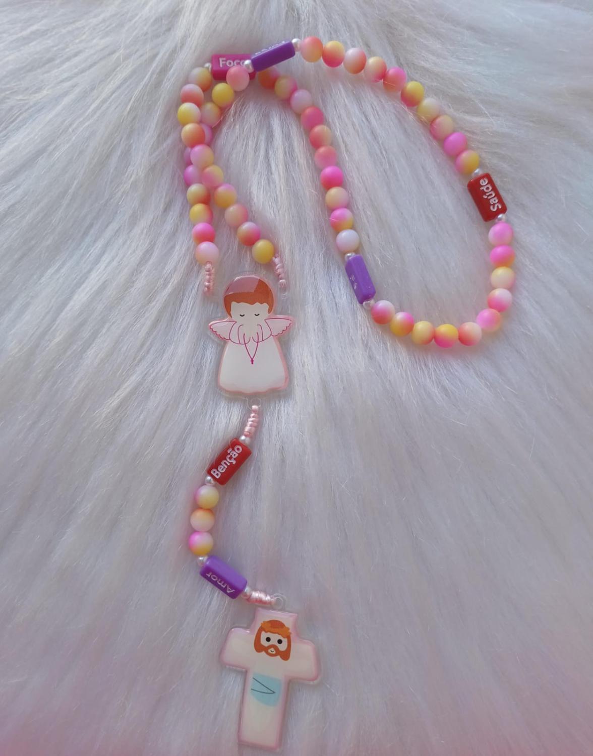 BOLA PLASTICA MESCLADA 8MM ROSA PAI NOSSO PLAQUINHA PLASTICA COLORIDA FIO CETIM ROSA TREVO E CRUZ EM ACRILICA TRANSPARENTE ADESIVADO