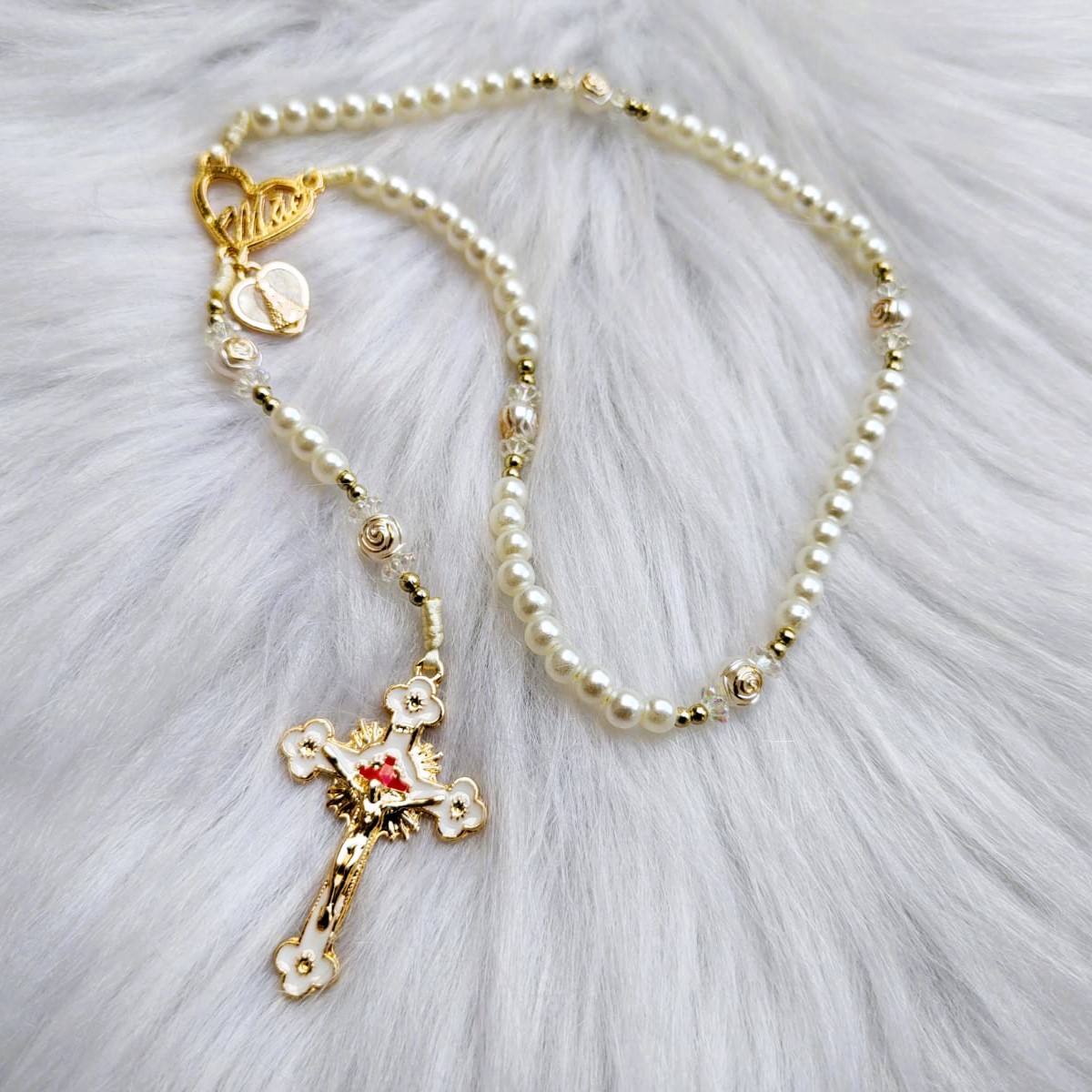 PEROLA 6MM CREME PAI NOSSO FORMATO ROSAS C/ DETALHES DOURADOS FIO CETIM CREME TREVO CORAÇÃO MÃE DOURADO PINGENTE CORAÇÃO APARECIDA RESINADO