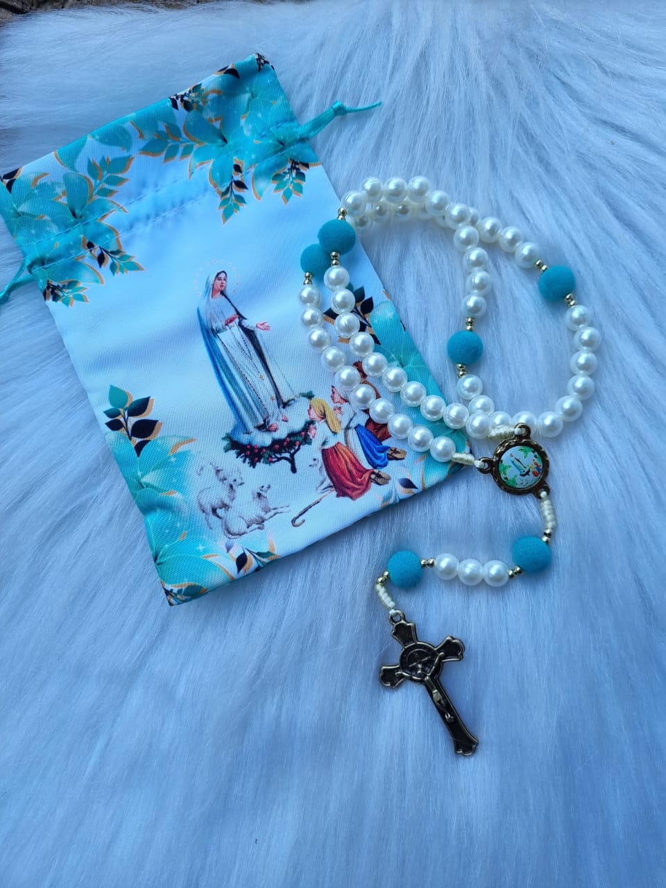 CONTAS EM PEROLA 8MM CREME PAI NOSSO BOLA VELUDO 10MM AZUL FIO CETIM CREME TREVO 13MM EM OURO VELHO CRUZ OURO VELHO SAQUINHO ORGANZA ESTAMPADO