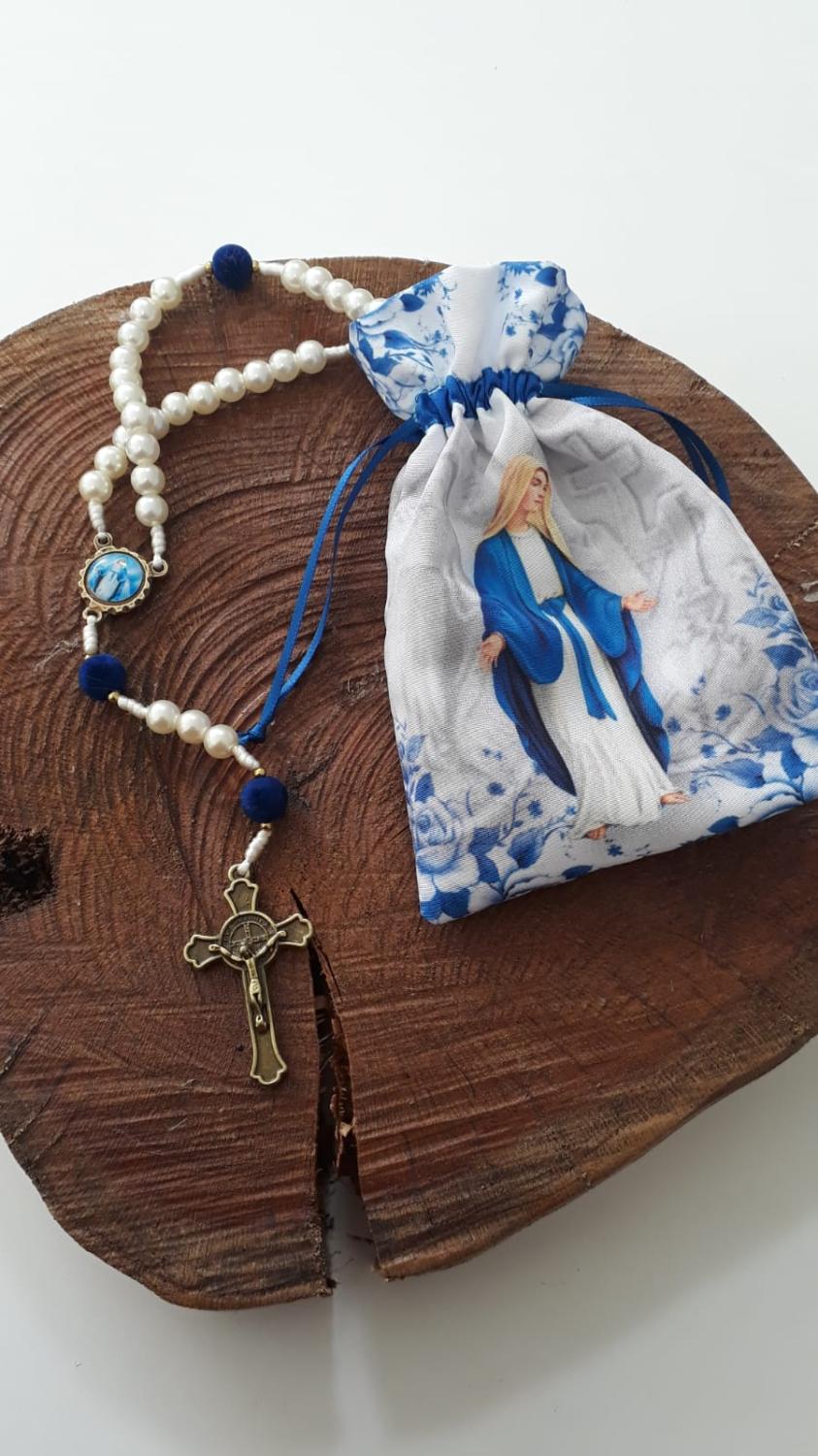 CONTAS EM PEROLA 8MM CREME PAI NOSSO BOLA VELUDO 10MM AZUL FIO CETIM CREME TREVO 13MM EM OURO VELHO CRUZ OURO VELHO SAQUINHO ORGANZA ESTAMPADO