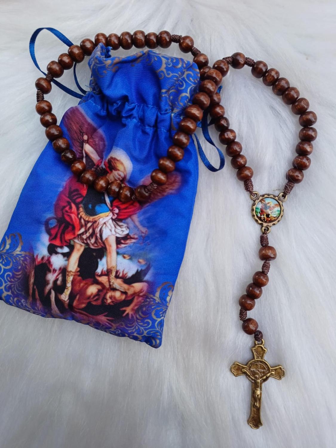 CONTAS EM MADEIRA 8MM MARROM FIO MARROM TREVO 13MM EM OURO VELHO CRUZ OURO VELHO SAQUINHO ORGANZA ESTAMPADO